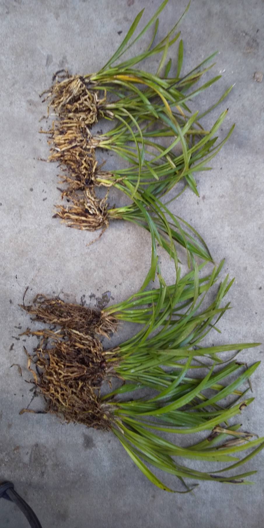 写真右の3本の苗は、花が終わった鉢から取り出した株の半分を3つに分けた苗。 左4本はその半分を古い根を取り除き流水で新って分けた苗です。